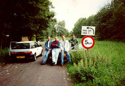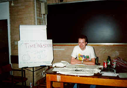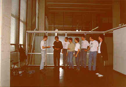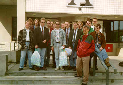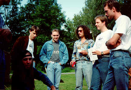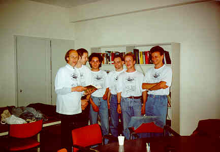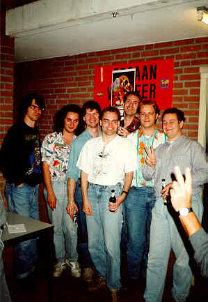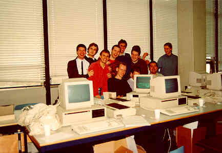 An early picture of the TimeWasters, taken in room HG 6.40 at the Eindhoven University of Technology. On it are, from left to right, Alph, Motto, Error, GigaWalt, Ace (sitting), PeeWee, Filuvio, Kroisos and Robb.