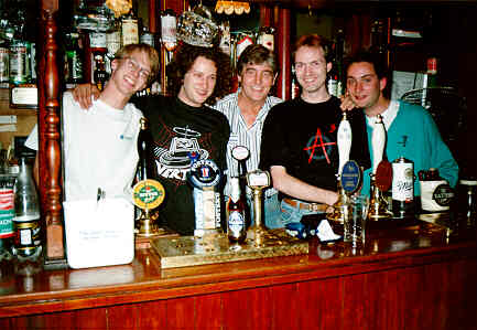 In an English pub in London after Access All Areas. From left to right: Tlaloco, Wave's brother, bartkeeper, GigaWalt and Wave.