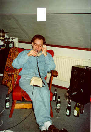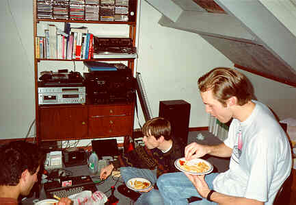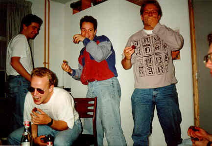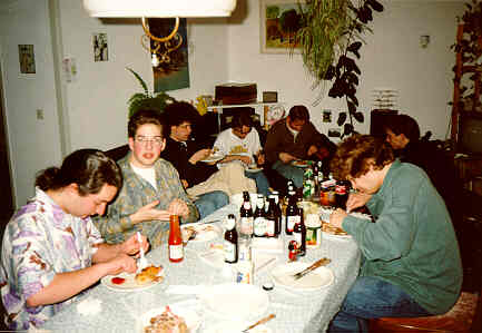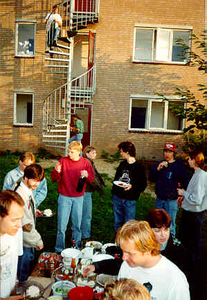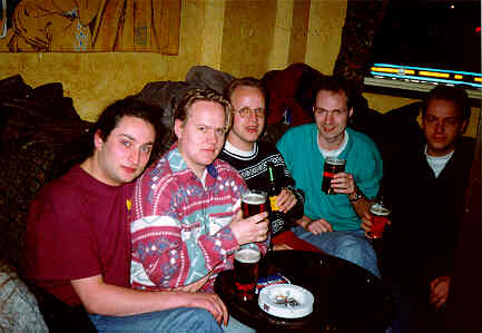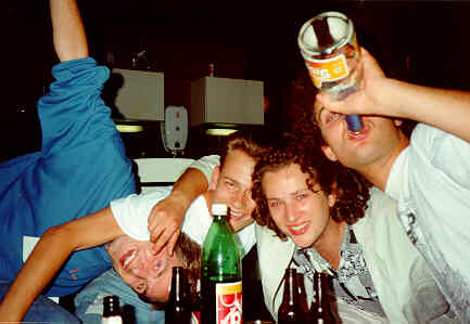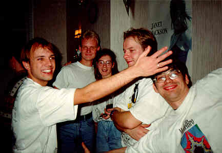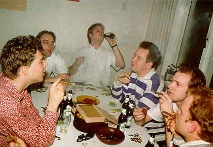 A party at Erwin's place. From left to right: Mandelbro, Wave, Alph, Herny, GigaWalt, Fidelio and Tommie.